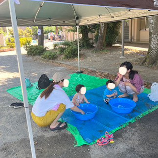夏本番!そんな暑さの中、今月のすくすくタイムではお庭で水遊びを準備! 告知していたこともあり、たくさんの親子が遊びに来てくれました♪ 幼稚園も夏休みの時期なので、いつものメンバーだけでなく、初めて遊びに来てくださった方もたくさん! テント下にマットを敷いて小さいお子さん用のスペースと、 おおきなお子さんがダイナミックに遊べるスペースを準備☆ たらい、水、カップやペットボトルを準備しておくと、それぞれに遊びだしていました! オープンチャットの告知を見てきてくださったと言う赤ちゃんとおかあさん。 初めての水遊び、どんな反応をするかな?と思っていたそう。 結果、、お子さんはお水大好きで、全身びしょ濡れになって水と親しんで遊んでいました! お母さんも嬉しいビックリ♪ 幼児さんも、自分で持ってきた遊具を洗ってはベンチに干しに行ったり、とにかく水をかぶったり!!笑 こんな遊び方もあるよ!と、大きさの違うカップに水を入れて移し替えるとあふれる様子や、 ペットボトルに穴をあけてシャワーを作ってカップで水を入れることを伝えると、さっそく実践! ペットボトルにそのまま水を入れるとどんどん水が流れてしまうのに気付くと、